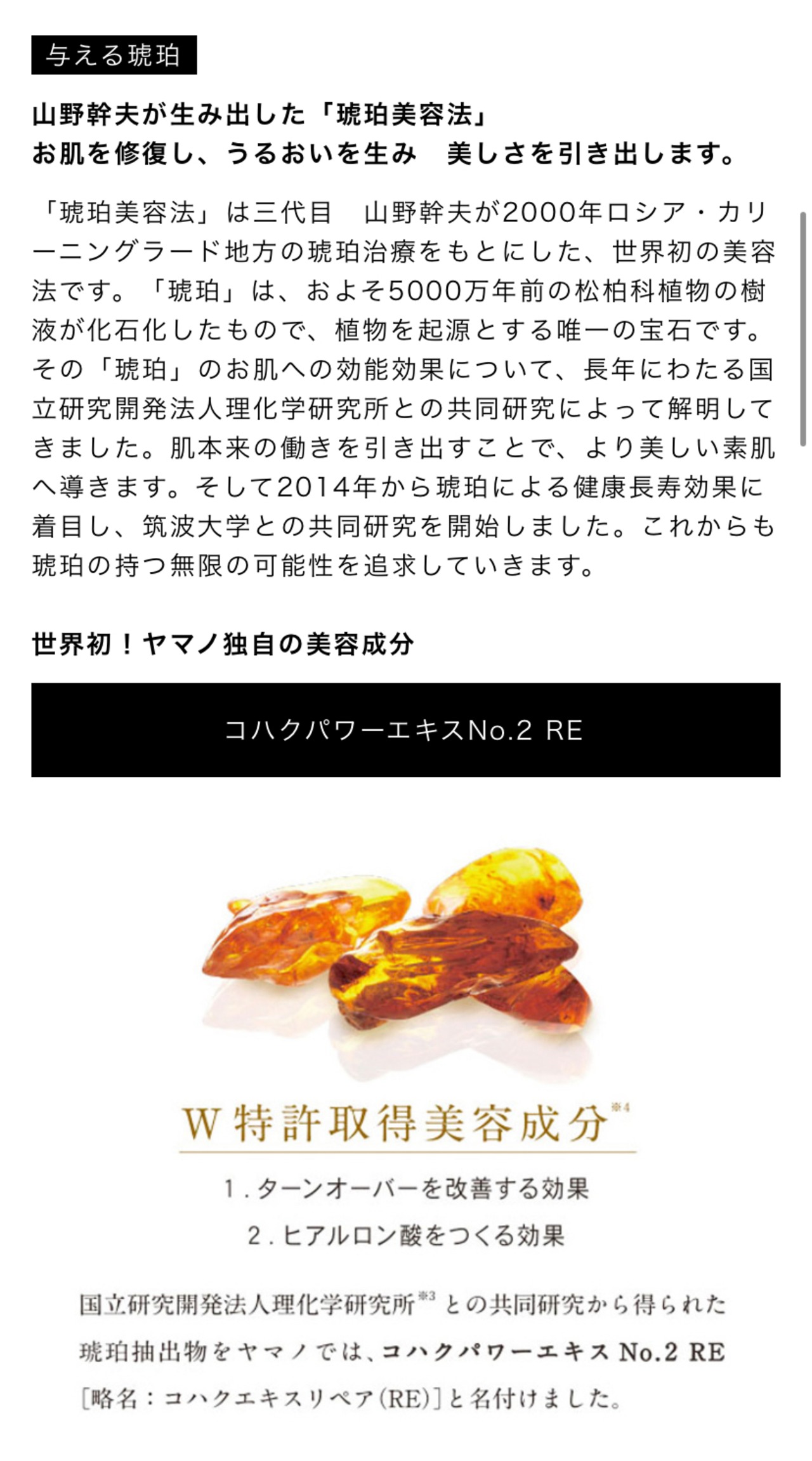 琥珀には美肌効果があることは古くから知られていますが、肌のターンオーバーやコラーゲン生成を促進させるコハクエキスも含まれており、肌を引き締めてツヤを与え若々しい肌へと導く効果が期待できます。ぜひ一度使ってみてください。