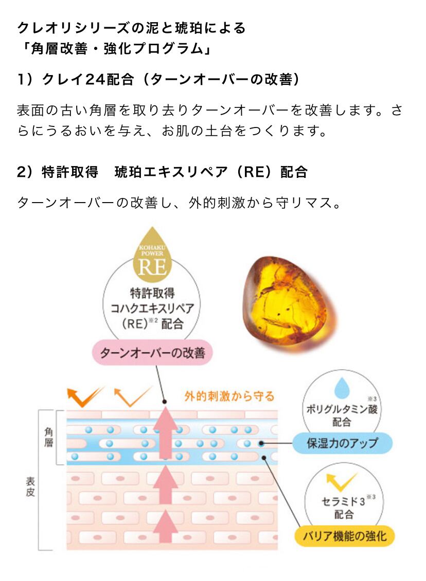 「琥珀を与えて潤い強化」のクレオリ24コハクスキンローションは、肌に必要な潤いを与えながら、未来への肌の強さをサポートします。