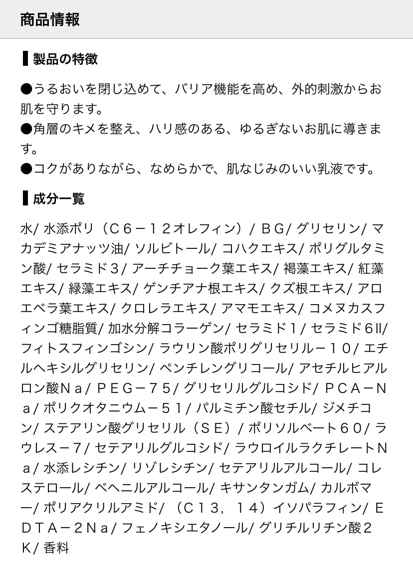大量に使わなくても肌にスッと馴染むミルクローション。忙しい時はオールインワンとしても使える保湿力バツグン、でもベタつかず肌にスッと馴染むのが特徴です♪